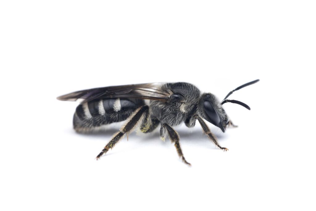 Hylaeus are small, shiny cosmopolitan bees. Both sexes are almost completely hairless with a characteristic pattern of yellow or whitish markings on the face, thorax, and legs, which contrast sharply with their predominantly black cuticles. Females usually have a pair of light-colored markings on each side of the face that vary in shade, shape and size depending on the species. Males emerge earlier than the females and have almost completely light-colored, mask-like faces. Unlike other wild bees, they lack pollen brushes and carry their supplies internally in their crop, mixing both pollen and nectar. This mixture is then regurgitated into the brood cells as liquid provisions for the larvae. All local species are solitary and can be observed mostly in summer.